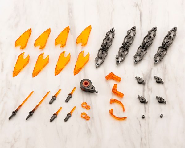 The parts can be assembled in a variety of different combinations such as the beautiful “wing mode” with a sharp silhouette, or “defense mode” as a body-length shield, and can be used to create unique customizations with other kits.
